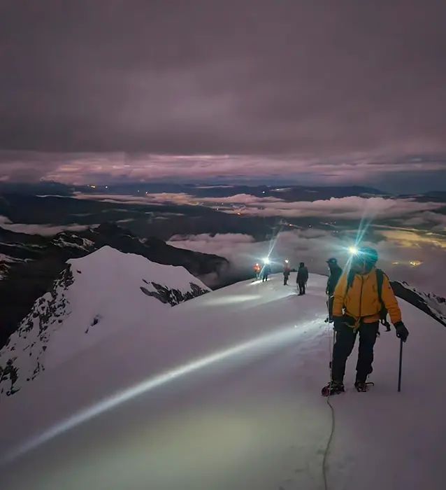 This dynamic two-day expedition offers an ideal introduction to high-altitude climbing, starting with a scenic approach from the Llaca Valley to a strategic Moraine Camp at 4,900 meters. The journey combines technical glacier training with a thrilling midnight ascent, navigating moderate slopes and crystalline ridges to reach the 5,686-meter summit. Standing atop Vallunaraju provides one of the most complete panoramic views of the Andes—including the massive Huascarán, Ranrapalca, and Huantsán—before a swift descent and return to Huaraz, making it a premier choice for those seeking a short yet powerful alpine experience.